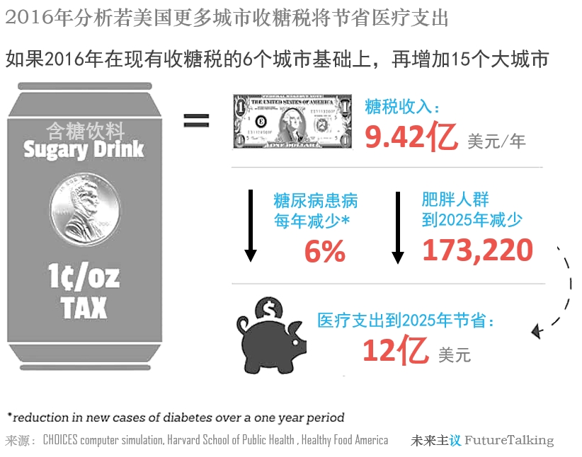 例如法国于2012年首次在全国范围内对非酒精性含糖饮料征收有针对性的税收,收取方式是按每公升饮料0.0716欧元,既包括普通饮料业包括代糖类型饮料,甚至包括调味矿泉水和加糖的果汁,但不适用于不添加的矿泉水和100%纯果汁。该税是实施后预估法国软饮料价格上涨了3.5%。2013年墨西哥实施糖税,2016年英国加入,2017年甚至印度、泰国也加入进来。等等,还有许多国家。美国并未在全境收缴,但有部分地区加入。以下是2016年美国Healthy Food America做出的分析,当时美国已有6个城市收缴糖税,如果2016年能再增加15个大城市,那么到2025年可节省12亿美元医疗支出。