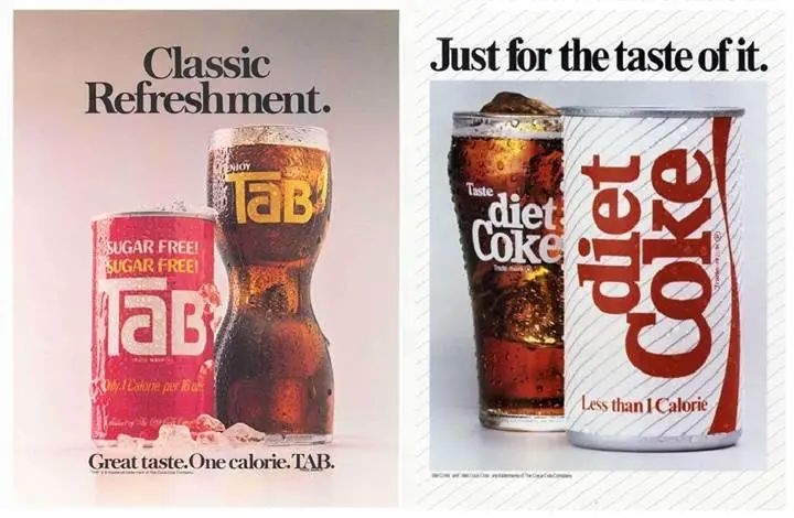 市场需求不是单维度的,消费者对某种产品或服务的期待,往往可能存在多维度的需求。然而在许多需求中,有些需求具有更高优先级,具有核心地位,因此不可以让步,或者说是这一品类之所以存在的根本。就碳酸饮料而言,我们之所以买来喝,绝不是因为它无糖零卡,而是为了它的口味带来的愉悦感官,如果没有了这种愉悦感官,也就没有必要喝可乐了,无论是有糖还是无糖。显然,对可乐而言,口味永远是第一位的,其次才是对无糖零卡需求的满足。从当时TaB和diet Coke的广告上也能看出,两者都有意特别强调了口味Taste,可见口味这一消费者需求维度对这一饮料品类的绝对意义。
