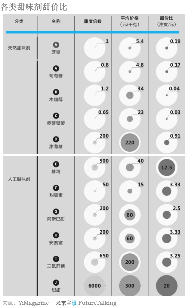 这里不得不又要说到上游关键原料中的天然代糖甜菊糖。与人工代糖相比天然代糖从某些植物中萃取获得,似乎更天然因而被认为更健康。首个商业化甜菊糖产品诞生于1971年,它的甜度是蔗糖的200倍,因此获得同样甜度口感摄入量要少得多。2008年美国FDA允许高纯度甜菊糖用于食品。目前在中国市场因元气森林无糖产品的成功,其主要采用的赤藓糖醇成为当下备受追捧的天然代糖。赤藓糖醇也并不是新发明,早在 1990 年,赤藓糖醇就被日本应用于糖果、软饮等食品中。然而赤藓糖醇的成本比其他代糖高很多。同样金额所获得的甜度,也就是所谓的甜价比,甜菊糖约是赤藓糖醇的30倍,更不用说和阿斯巴甜等人工甜味剂相比了。这也可能是作为大众产品,销量巨大而利润敏感的类型不太容易接受赤藓糖醇的原因。比较以下元气森林汽水与零度可乐的价格就知道了。在可口可乐公司旗下其他相对小众的产品中你会发现也不乏赤藓糖醇的身影。