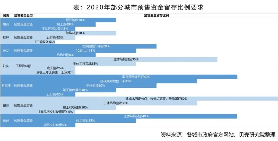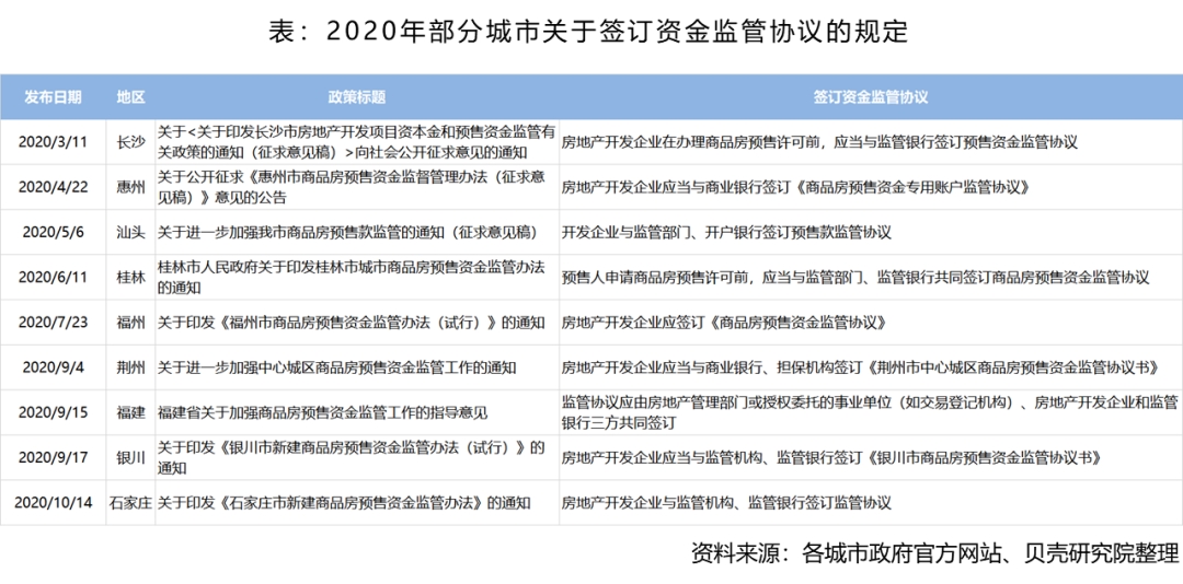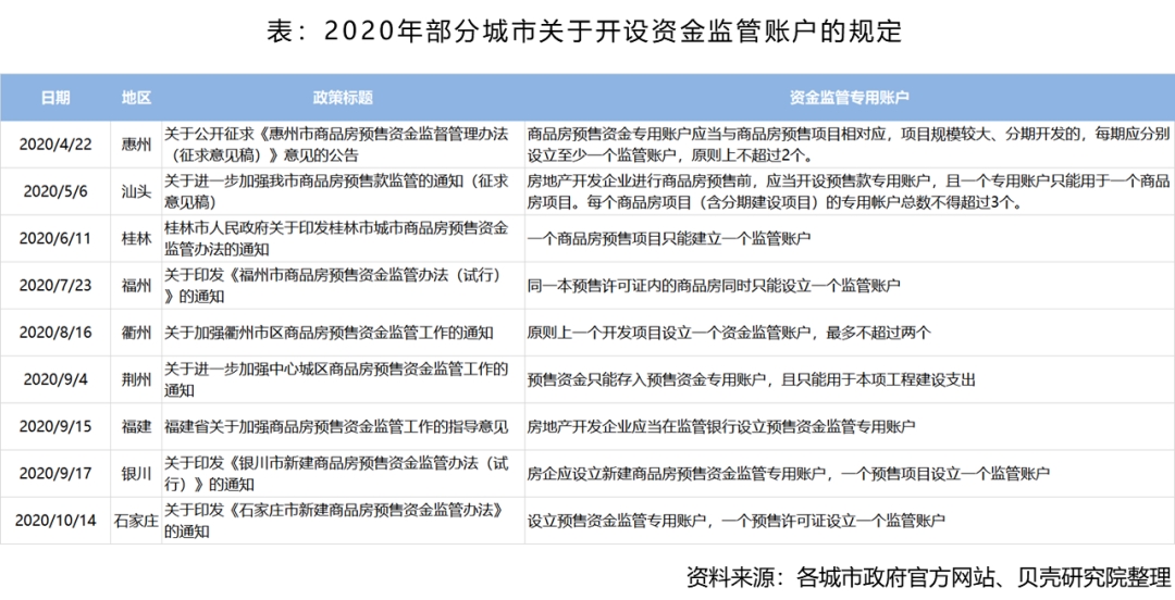1. 2020年以来各城市加强预售资金监管的政策主要聚焦于开设资金监管账户、签订监管协议、不同房企的差别化资金监管、预售资金留存比例要求等。