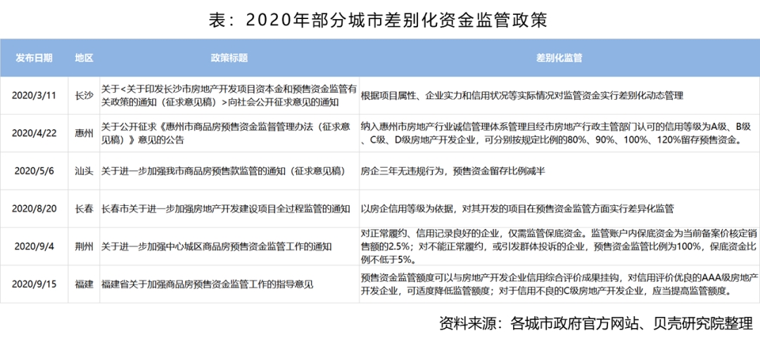 在预售资金监管额度上,长沙、惠州、长春、荆州、汕头等城市规定根据房地产开发企业的信用状况、综合实力等情况,实行差别化管理。具体来说,对信用较好、综合实力较强的房地产开发企业,降低资金监管比例,对信用较差、未正常履约的房地产开发企业按较高额度予以监管。