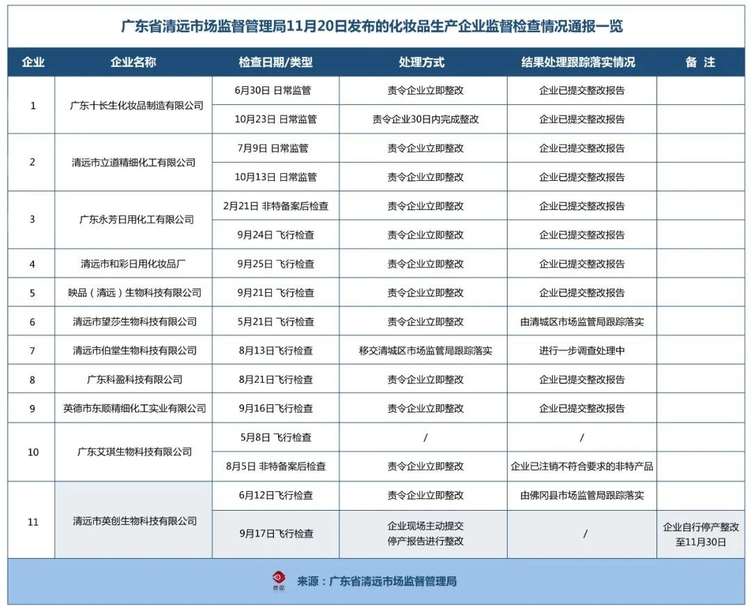 据悉,广州省清远市场监督管理局此次通报的信息,是根据《广东省2020年化妆品生产企业监督检查计划》,对照《广东省食品药品监督管理局日常检查记录表》进行化妆品生产环节的检查结果,包含了今年以来对辖区内化妆品企业的日常监管 、非特备案后检查和飞行检查三大检查。其中,10家被要求立即整改的企业中大多数已提交整改报告;另有清远市英创生物科技有限公司自行停产整改至11月30日。