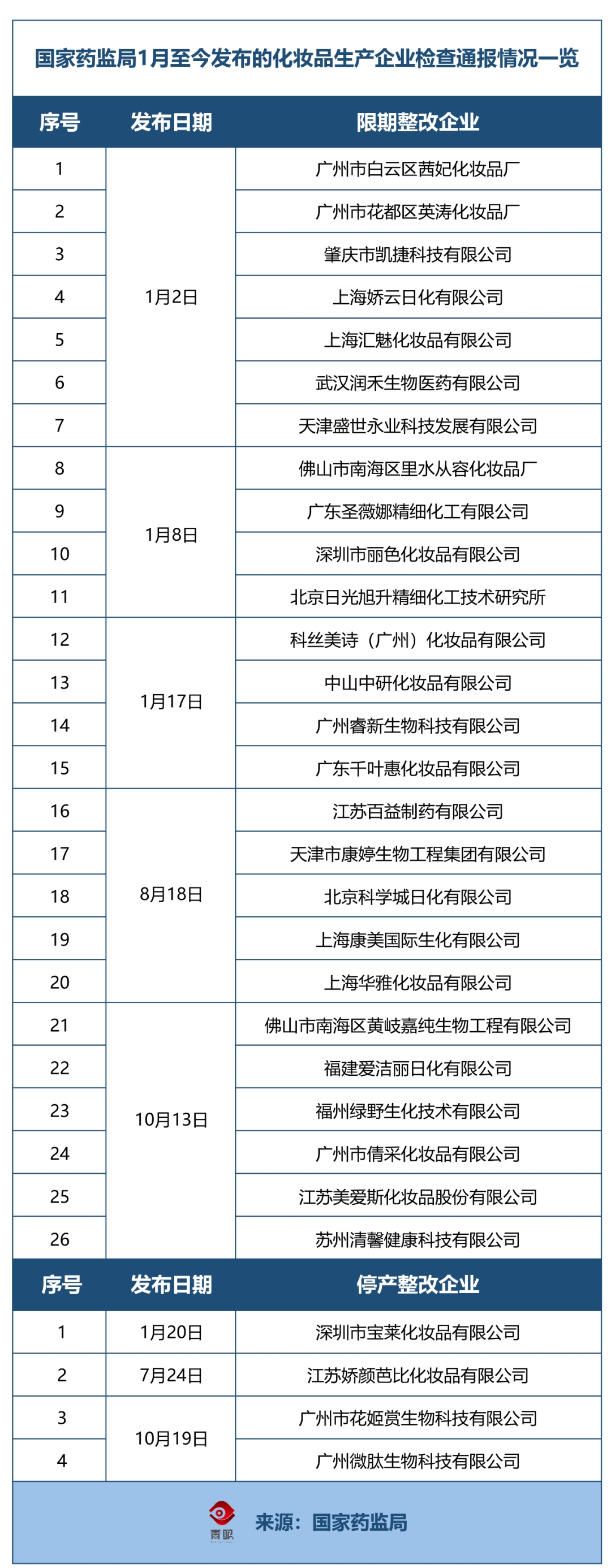 11月20日,广州省清远市场监督管理局公布辖区内化妆品生产企业监督检查结果显示,10家企业被要求立即整改,1家企业停产整顿;9月25日至11月18日,广州市场监督管理局分三期通报57家化妆品生产企业飞行检查结果显示,17家企业停产整改,其余40家企业限期整改……而青眼梳理今年以来国家药监局通报的30家企业的飞检结果中,4家企业停产整改,26家限期整改。
