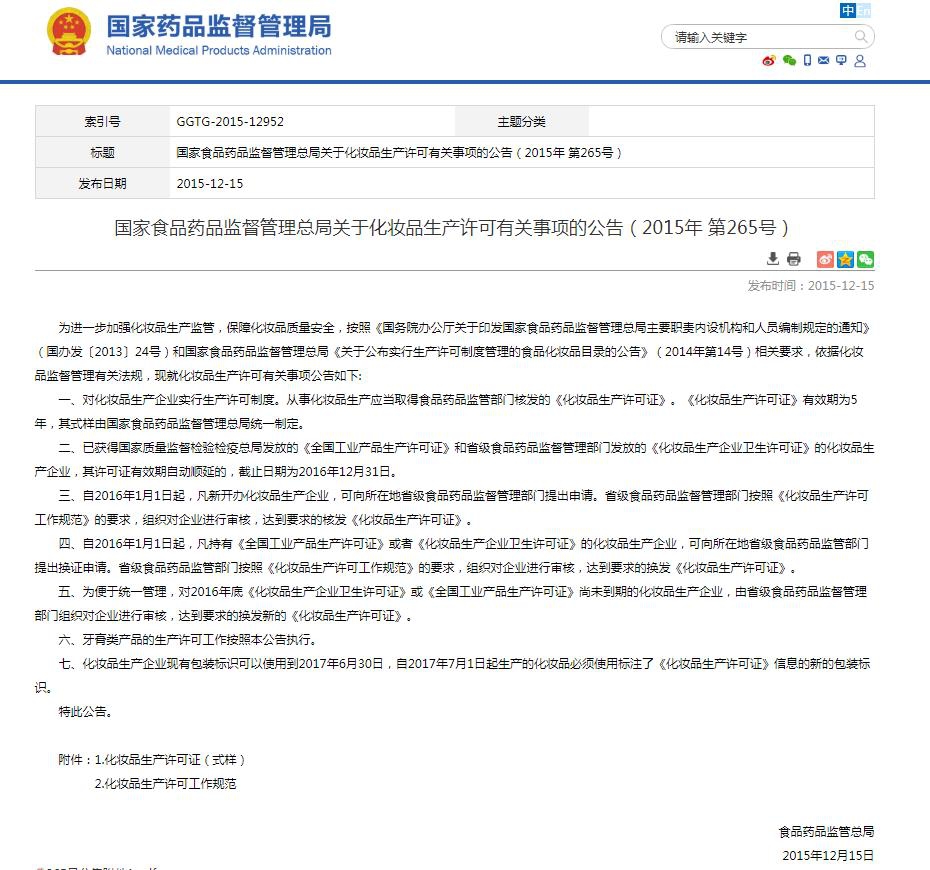据悉,国家药监局于2015年12月15日发布《关于化妆品生产许可有关事项的公告》及《关于做好化妆品生产许可有关工作的通知》规定,自2016年1月1日起,凡持有《全国工业产品生产许可证》或者《化妆品生产企业卫生许可证》的化妆品生产企业,应于2016年12月31日前完成换取《化妆品生产许可证》工作(即俗称的“两证合一”)。2017年1月1日起,未取得《化妆品生产许可证》的化妆品生产企业一律不得生产。