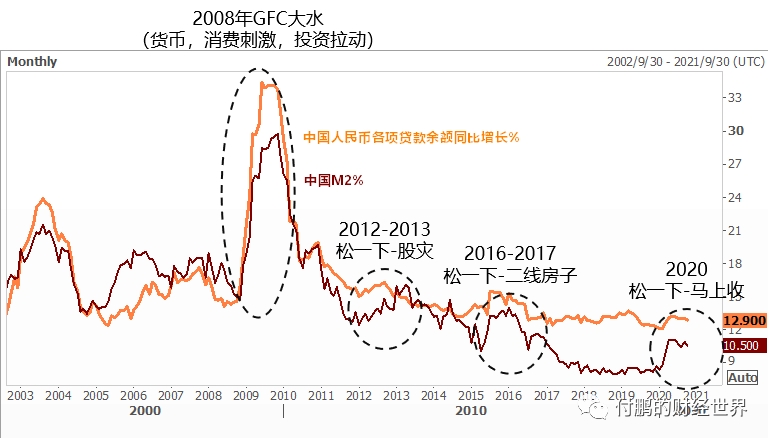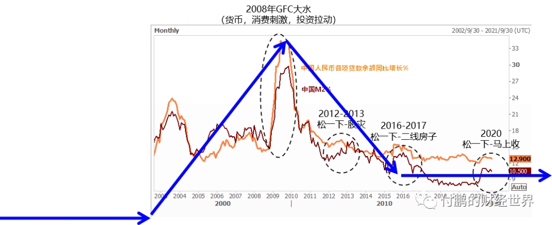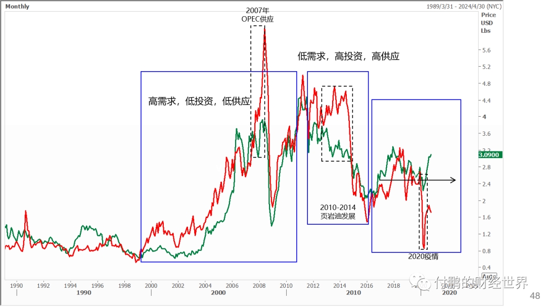2000年中国入市计入到全球市场之前,我们从战后上一轮周期的末端走出来,经历了前面一轮真正周期的末端,从低需求,低供应,低投资,低库存的阶段磨了数年,随着中国入市,总需求开始助推(表观需求的实际激增且持续)(宏观表现可以是中国GDP增长,可以是中国信贷增长,可以是中国投资增速,可以是中国M2增速,可以是四大部门杠杆等)海外需求同时在金融杠杆的推动下也计入全球化反馈,这是那十年大宗商品牛市大周期的根基,随着低投资转为高投资,供应也转为高供应,但是价格仍然能够维持高位这都得益于高需求和高供应的并存;