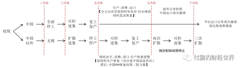 这种疫情应对方式的不同最终引发的反馈路径简单的总结成为两张图,这张图在之前二季度末讨论差异性的时候就已经展示过,基本如下,当然如果从经济到商品供应和需求的角度去细化的话,就在里面标注一下内外需求和供应: