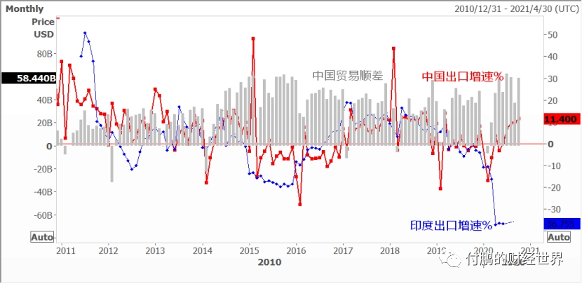图:中国和印度都是作为生产环节,在出口增速上出现了巨大的劈叉