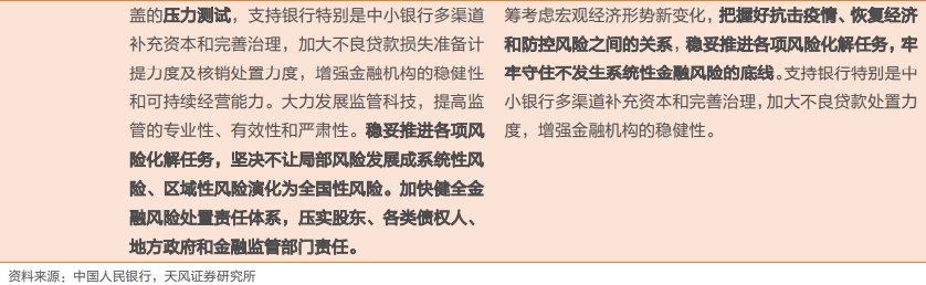 此外,对于疫情冲击下不良贷款风险可能会滞后反映,央行继续提出“加大对中小银行发行永续债等资本补充工具的支持力度,加大不良贷款损失准备计提力度及核销处置力度,提升银行服务实体经济和防范化解金融风险的能力”。