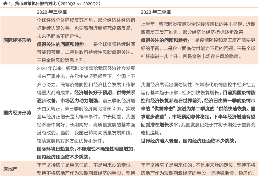 (1)宏观经济形势:三季度报告延续对经济形势的乐观判断,但对于外部担忧则主要提到三点:一是全球疫情持续性持续时间可能超预期;二是财政可持续性风险值得关注;三是金融风险隐患上升(股市回调、非银脆弱等)。除此之外,央行特别指出“疫情冲击带来的金融风险存在一定时滞,未来不良贷款有上升压力。