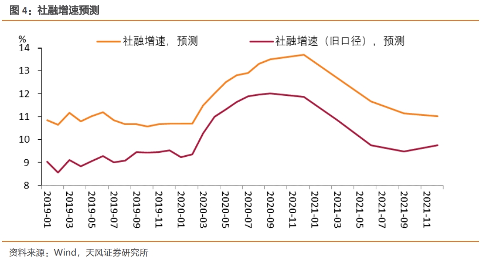 团队前期报告《怎么剔除明年经济增速的基数效应?》指出在乐观预期下明年经济潜在增速可能在5.5%左右,而我们预测明年GDP平减指数增速约为1.5%,因而明年反映潜在产出的名义GDP增速约为7%。而疫情前2019年社融增速与名义GDP增速(也是当年的名义潜在增速)的差值约为3%,照此推算明年社融增速可能在10%左右。