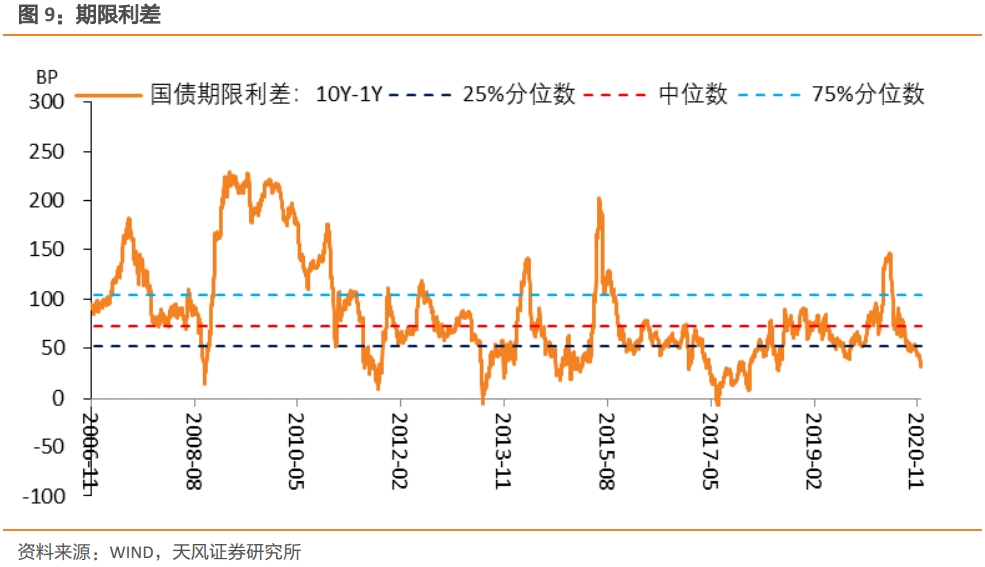 10月以来,收益率曲线进一步平坦化,国债期限利差进一步收窄,目前处于2006年以来10%分位数附近,处于2018年以来的2%分位数的附近。