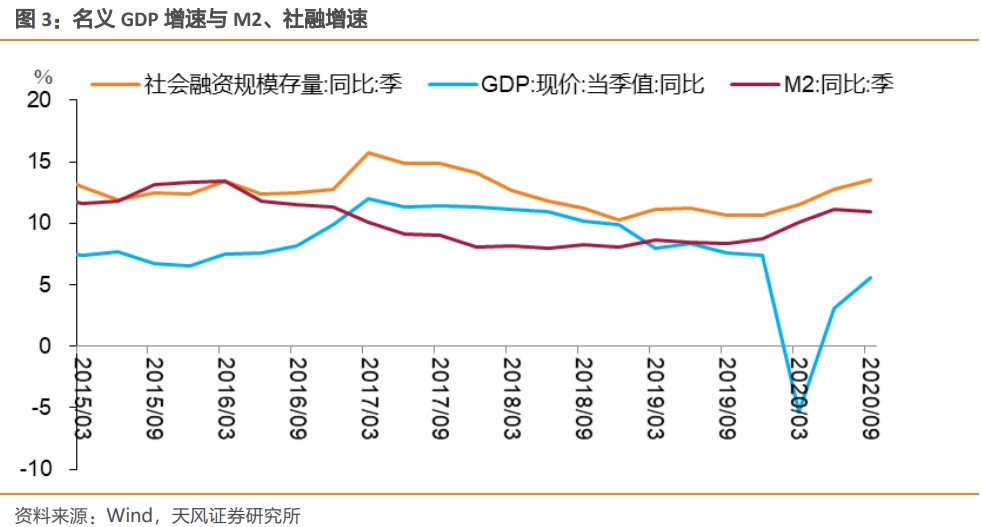 2020年《政府工作报告》提出“引导广义货币供应量和社会融资规模增速明显高于去年[1]”,二季度报告则提到“保持货币供应量和社会融资规模合理增长”,三季度报告则是强调“社融和M2增速与反映潜在产出的名义GDP增速相匹配”,这意味着M2、社融和GDP名义增速之间的缺口将会收敛。