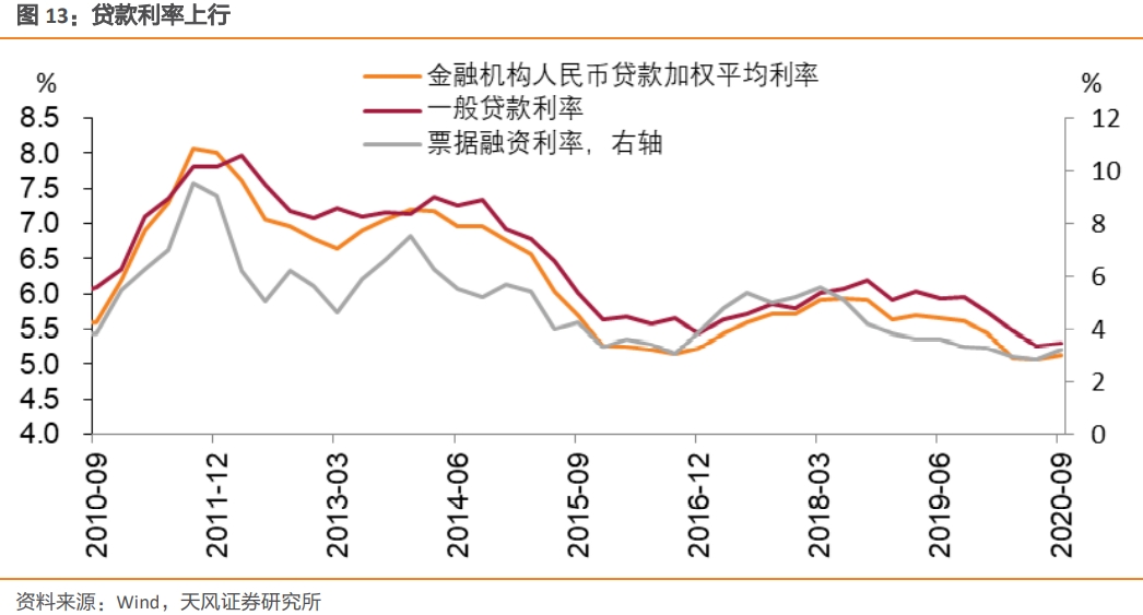 三季度MLF利率和LPR均保持不变,而央行继续推动LPR改革(8月末存量浮动利率贷款定价基准转换进度已达92.4%)和两个直达实体经济的货币政策工具。不过,纵使如此三季度贷款利率却出现了边际上行,贷款加权平均利率、一般贷款利率、票据融资利率分别较二季度上升了6BP、5BP、38BP(不过仍比去年底要低),反而是个人房贷利率下降了6BP。