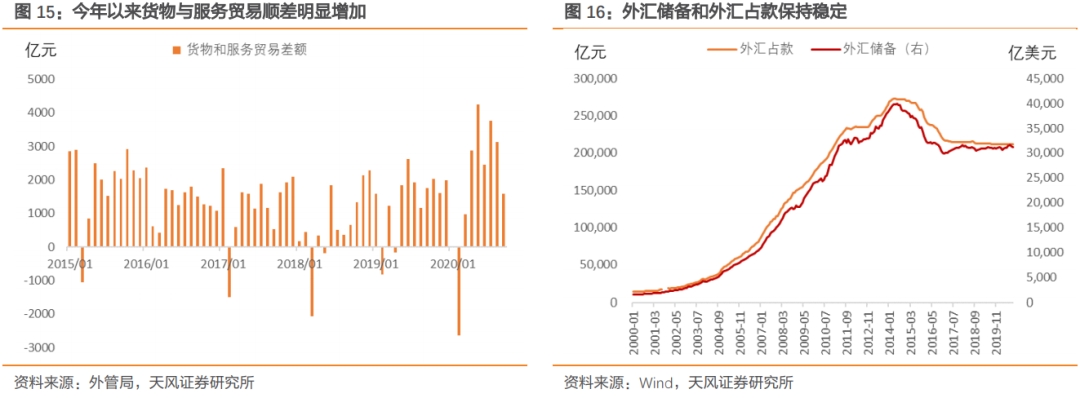 资本流动有进有出,“这种格局是健康的”。此前市场一直有一个困惑:今年以来经常项目大幅顺差,资本项目(除储备资产)逆差也不大,那么为何没有体现在外储储备和外汇占款上?如果观察外管局的国际收支平衡表,最终体现为“净误差和遗漏”项流出明显增多,从而抵销了经常项目顺差流入。同时,三季度货币政策执行报告中也给出了部分解释:“资本自主流出增多,主因是境内银行等主体自主增加境外资产,境内主体提高了境外资产占比。”,同时,特别强调“这种格局是健康的”。合理估计,国际收支基本平衡+汇率弹性增大上下浮动可能是一个合意的组合。