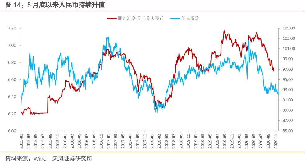 增强汇率弹性、注重预期管理。对于今年以来汇率升值的看法:一方面人民币兑美元升值幅度小于欧元、日元兑美元升值幅度;另一方面参考一篮子货币来看,CFETS指数“升值幅度比较适中”。对于未来人民币汇率,央行重提“发挥市场在人民币汇率形成中的决定性作用”,同时强调“不进行外汇市场常态化干预”。如果未来全球经济继续复苏,大概率仍将是弱美元格局,人民币兑美元还有进一步走强的空间,除非市场预期变化影响汇率走势和资本流动,预计央行也不会进行过多的干预。可以看到,10月10日央行将远期售汇风险准备金下调至零,可能主要还是以预期引导为主,并未改变人民币升值的趋势。此外,对于内外平衡央行强调“货币政策制定和实施必须以我为主,市场化的汇率有助于提高货币政策自主性”,如果央行过多干预升值则货币政策可能需要被动宽松,这显然不符合当前货币政策的取向。