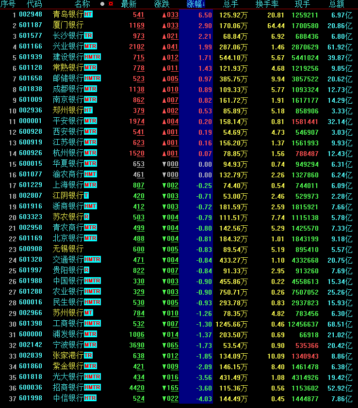 11月30日,37只银行股中,14只上涨,21只下跌。其中,青岛银行领涨,收盘5.41元,上涨6.50%,厦门银行、长沙银行涨超2%;另外,光大银行、招商银行、中信银行跌幅超3%。