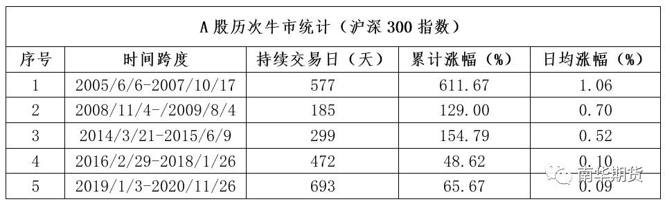 近期,沪深300指数和上证50指数先后突破前高,创五年以来的历史新高。这次新高来的低调,甚至很多人并没有感受到“牛市”的气息。但是,如果我们回顾2019年初至今的行情走势会发现,这一轮牛市已经走了将近两年的时间,虽然过程比较曲折,但是向上的趋势一直十分坚定。当前沪深300距离2015年的高点仅8%左右,距离2007年的高点不到18%。从过往牛市的统计数据来看,截至目前为止这一轮牛市的持续时间已经创了历史记录,比2007年大牛市的时间还多出20%的时间。但是,这一轮牛市的上涨速度是历史上最慢的,日均涨幅只有0.09%,比2016-2017年的慢牛行情还要慢。