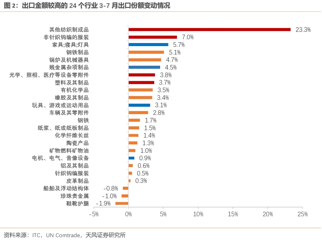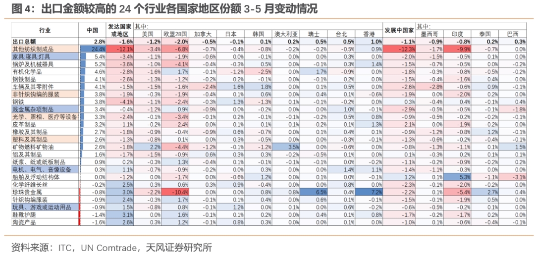 进一步考察中国出口金额较高的24个行业,这些行业占比总出口额接近85%,对出口份额提升的贡献接近90%,具有较强代表性。份额增长幅度最大的是其他纺织制成品,口罩的旺盛需求带动行业3-7月出口份额增长了23.3%。其他防疫相关的3个行业份额占比也都取得了明显上升。非针织钩编服装、光学照相医疗设备和塑料及其制品受益于防护服、输氧设备和手套等防护物品需求拉动,出口份额增长了3.7%-7%不等。