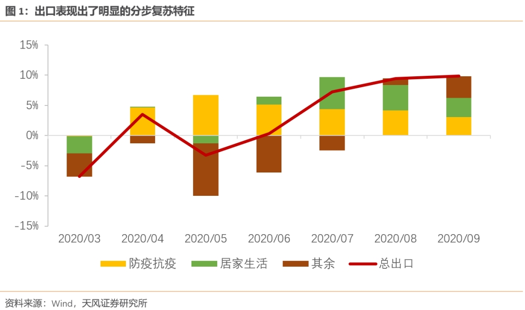 今年以来,出口在行业上表现出明显的分步复苏特征:第一步与防疫抗疫直接相关,本年受疫情驱动,需求快速释放。3月中国复工复产后,防疫抗疫类行业出口先行复苏,对总出口的增长起到了关键性作用,海关总署数据显示,上半年包括口罩在内的纺织品出口同比增长32.4%,医疗仪器及器械出口同比增长46.4%。第二步与居家生活相关性较高,需求受到了疫情的间接催化。5月之后,防疫抗疫品类的贡献逐渐回落,居家生活品类对总出口的贡献由负转正,同步拉动出口高增。第三步是顺周期的其他行业出口,复苏节奏相对较慢,订单直到三季度末才逐渐好转。