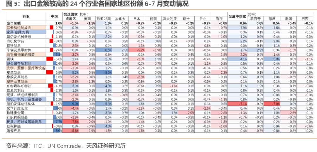 我们计算了今年前7个月主要经济体的24个行业出口份额的变动情况。整体来看,3-5月中国内地主要挤占了美国(-1.2%)、欧盟(-2.0%)、墨西哥(-0.9%)、印度(-0.8%)等国家或地区的出口份额,对瑞士、泰国、巴西、中国香港、中国台湾的挤占效应并不明显;结构上看,中国内地对发达国家的份额挤占在高附加值行业上比较明显,对欠发达国家的份额挤占集中在低附加值行业。