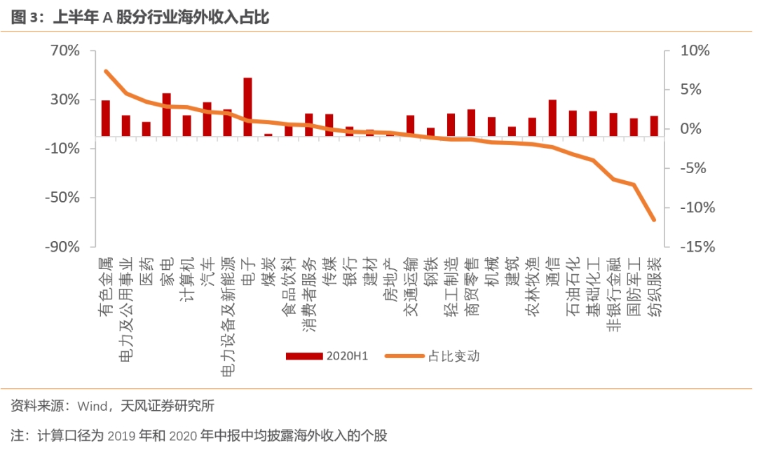 在出口高景气的推动下,上半年A股有色金属、电力及公用事业、医药、家电、计算机、汽车、电力设备新能源、电子等板块上市公司的海外收入占比有所上升。健康元(600380.SH)在半年报里写道:“随着新冠肺炎疫情在海外持续蔓延,生产停滞,物流不畅等因素导致海外原料药供给不足,海外订单向国内转移明显,公司抓住机遇,大力开拓海外市场,上半年美罗培南(混粉)出口实现大幅增长。虽然疫情仅是影响原料药供需格局的一个短期因素,但是公司将借此契机拓展产品的国际市场空间,进一步提升公司整体竞争力。”疫情是对全球供应链的一次压力测试,中国在疫情防控和复工复产过程中展现出的优势为企业出海创造了条件。