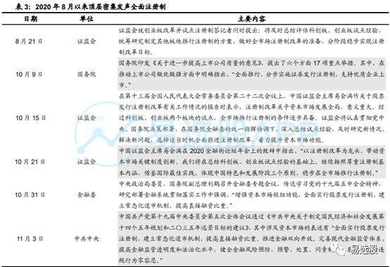 中国证监会主席易会满在题为《提高直接融资比重》的署名文章中提出了提高直接融资比重的六大重点任务,其中最为引人注目的一点是他提到了将来将会全面实行股票发行注册制,拓宽直接融资入口。全面注册制改革这一观点自2020 年 8 月以来,顶层通过多种方式持续发声,全面注册制改革已经箭在弦上。