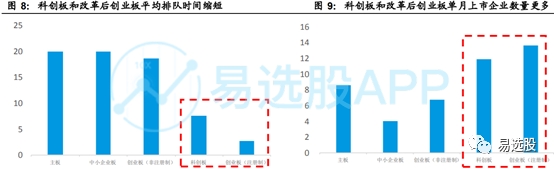 统计数据显示,核准制下的主板、中小板以及注册制改革前的创业板从 IPO 申报预披露到最终上市的平均周期进 20 个月,而科创板进行注册试点后排队时间缩短为 7.5 月,创业板注册制改革后上市周期降为 2.6 个月,时间有效压缩,进程大幅提升。可以预见,全面实行注册制后,主板及中小板的审核周期也将缩短,企业上市进程将加快。