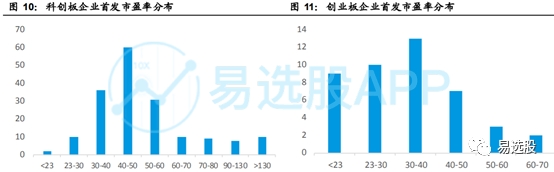 就科创板和创业板的注册制实施情况来看,发行定价打破了核准制下 IPO 新股发行市盈率不得超过 23 倍市盈率的定价机制,首发市盈率更多的集中在 40 倍左右,尤其是科创板,科技智能领域的企业定价更是达到了 60-70 倍以上,企业间定价差别较大,市场对不同行业和企业给予不同的估值预期。