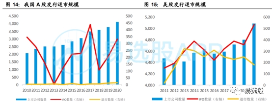 我国 A 股上市公司退市数量远低于 IPO 数量。对比美股市场,2011 年至 2019 年底,美股平均每年 IPO 数量为 291 家,退市数量平均为 230 家,退市率远高于我国现行退市率。究其原因,在于核准制下发行门槛高、发行程序冗长、发行成本高昂,已上市的企业即使业绩不佳也不愿退市,寄希望于壳资源的再次炒作,保壳动力强。由于垃圾股没有及时清退出市场,资本市场资源配置能力受限。