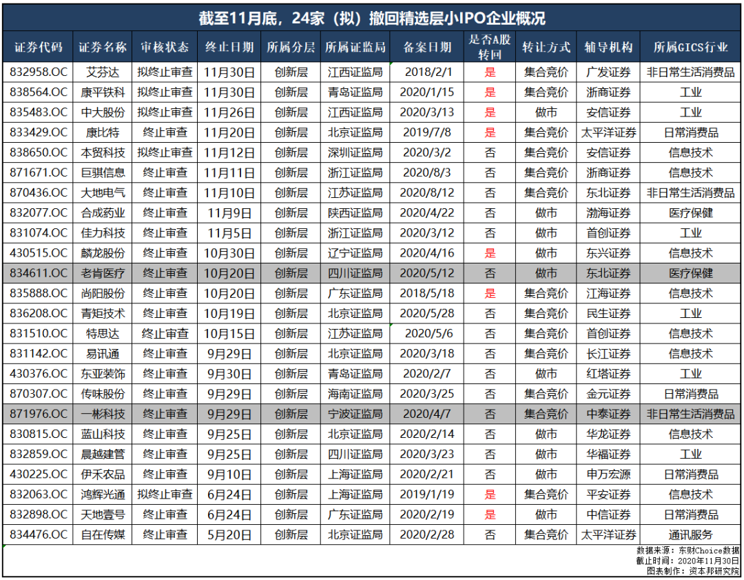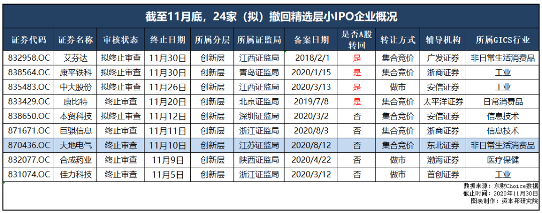 据资本邦不完全统计,截至2020年11月底,拟精选层小IPO的企业已多达293家,其中包含24家(拟)终止企业。