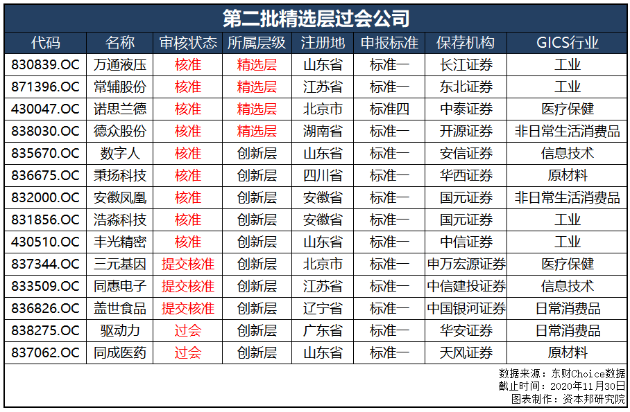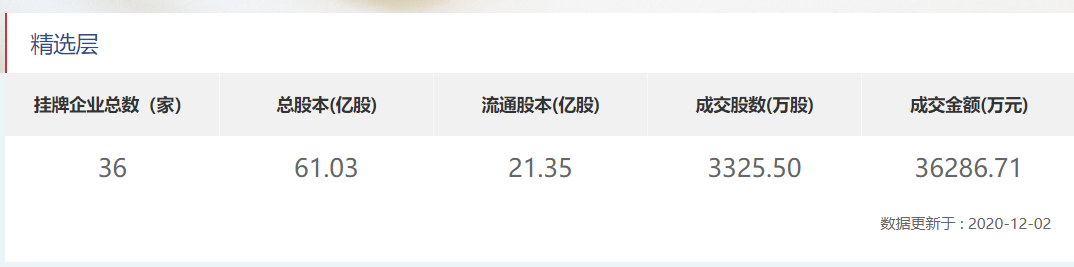 随着审核过会等程序的推进,11月,第二批精选层企业也“错落”入场。万通液压(830839.OC)、常辅股份(871396.OC)、诺思兰德(430047.OC)、德众股份(838030.OC)4家企业先后正式挂牌精选层。迄今为止,精选层挂牌企业已增加至36家,总股本合计61.03亿股!