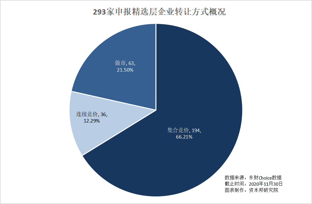 从转让方式来看,集合竞价的企业为194家,占比达66.21%;连续竞价转让36家,占比12.29%;做市转让63家,占比为21.50%。