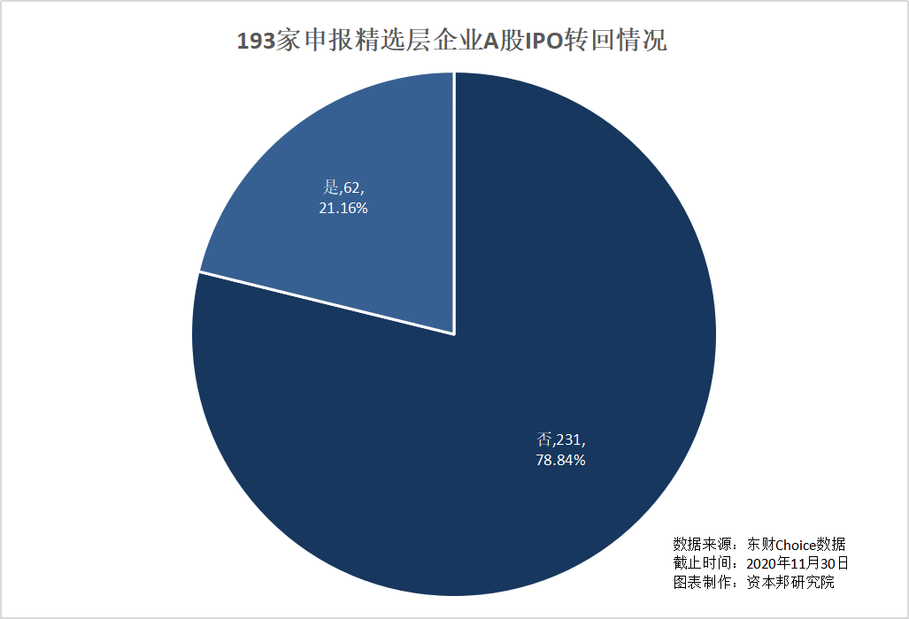从A股IPO转回情况来看,11月未新增A股转回企业。因此,在293家精选层备战企业中,62家为A股转回企业(包含曾A股IPO失败企业),占比为21.16%;231家企业属于非A股转回情况,占比为78.84%。