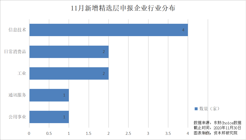 从GICS行业分布来看,11月新增的10家拟申报精选层企业来自5个行业。其中,来自信息技术行业的企业最多,有4家之多;来自日常消费品行业、工业领域的企业各有2家,来自通讯服务、公用事业的企业各1家。
