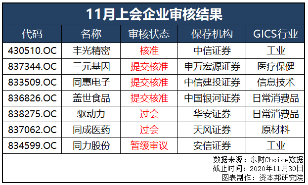 自精选层审议会重启以来,截至11月底已有14家企业顺利过会。其中,9月、10月各过会4家;11月份过会了6家,分别为丰光精密(430510.OC)、三元基因(837344.OC)、同惠电子(833509.OC)、盖世食品(836826.OC)、驱动力(838275.OC)、同成医药(837062.OC)。此外,同力股份(834599.OC)被暂缓审议。