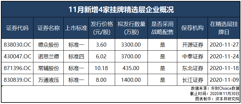 本月,有4家企业陆续在新三板精选层鸣钟上市:万通液压(830839.OC)、常辅股份(871396.OC)、诺思兰德(430047.OC)、德众股份(838030.OC),分别于11月9日、11月18日、11月24日、11月27日在全国股转系统精选层挂牌。