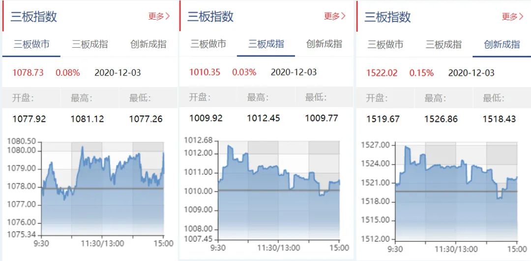 截至12月3日收盘,三板做市报1078.73点,上涨0.08%;三板成指报1010.35点,上涨0.03%;三板创新成指报1522.02点,上涨0.15%。