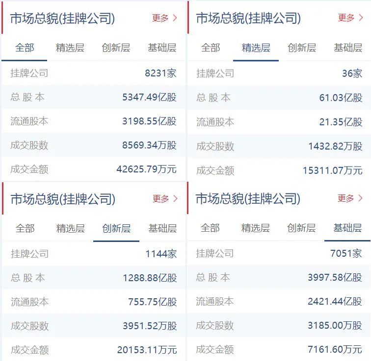 新三板挂牌公司总计8231家(精选层36家,创新层1144家,基础层7051家),总股本5347.49亿股,流通股本3198.55亿股。