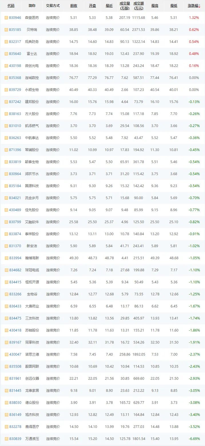 12月3日,精选层普跌,36家企业5家涨,2家平盘,29家跌;其中,森萱医药(830946)涨幅居首,上涨1.32%;其次,贝特瑞(835185)上涨0.62%;万通液压(830839)跌幅居首,下跌6.69%;鹿得医疗(832278)居次,下跌3.52%。