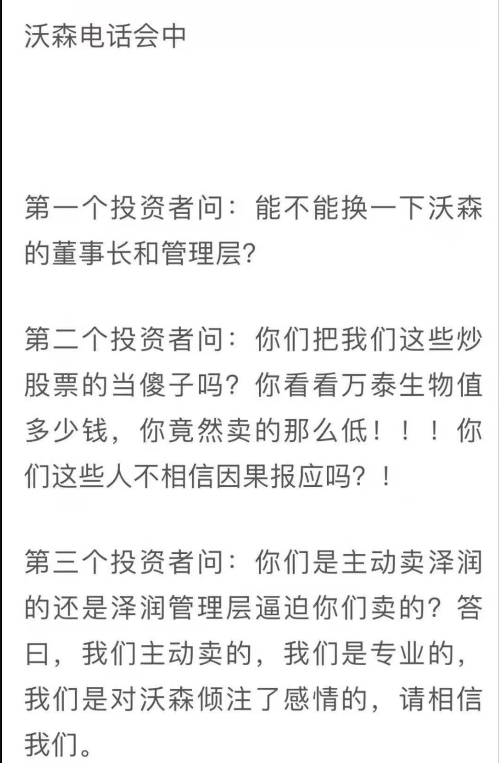 第三个投资者问:你们是主动卖泽润的还是泽润管理层逼迫你们卖的?