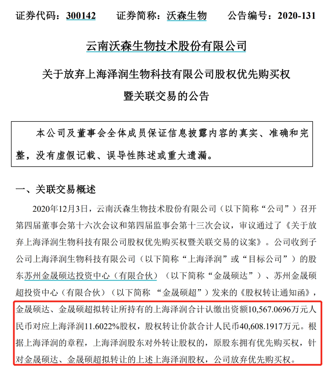 事情是这样的,昨晚(12月4日),沃森生物公告以11.4亿元转让上海泽润32.60%股权,同时放弃增资的优先认可权,交易完成后上市公司持有上海泽润28.5%的股权(之前67.8%),上海泽润将不再是其控股子公司。