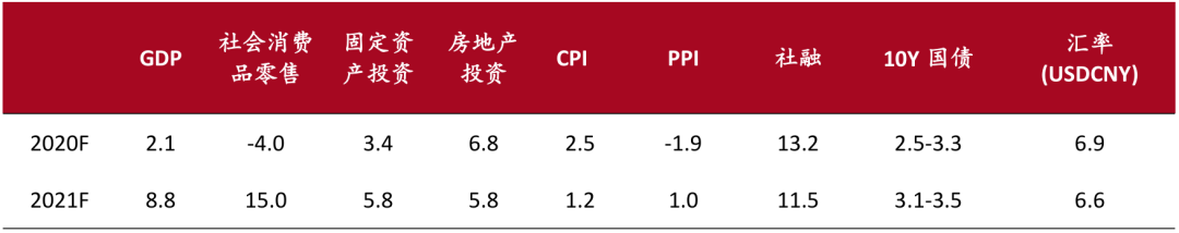 ■ 宏观政策“而今迈步从头越”。回望过去,积极的财政政策和稳健的货币为我国经济从贸易摩擦和疫情冲击中复苏起到了积极作用。展望2021年,在“十四五”的开局之年,政策将从跨周期的角度考虑,为中国经济在未来五年跨越“中等收入陷阱”保驾护航。当前,货币政策正从应对疫情冲击的偏宽松状态向后疫情时代的稳健中性取向回归,“稳货币”“稳信用”或将成为今年末和明年初的政策基调。预计明年末社融和M2增速将分别回落至11.5%和9.5%。明年下半年可能有一次全面降准,幅度为50bp;年末1年期LPR和5年期LPR继续保持不变,分别为3.85%和4.65%。财政政策方面,预计2021年目标赤字率大概率将下调至不高于3%的“常规”水平,特别国债将不会继续发行,新增专项债限额将大致为3.5-4万亿元,继续扩大减税降费规模的可能性较小。