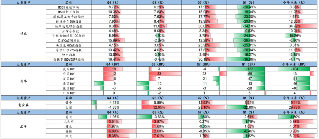 从节奏上来看,Q1在疫情的冲击下,市场呈现 “避险(Risk-Off)”格局,美债、美元、日元、黄金等避险资产上涨,而全球权益资产则出现大幅下挫;Q2在超常规政策的支持下,权益市场全线反弹,美债、黄金延续偏强,而美元则在流动性泛滥的影响下出现高位回落;Q3-Q4大类资产在经济弱复苏、货币财政“双宽松”以及疫情反复之间不断拉锯,权益市场、黄金涨幅缩窄,美债利率低位反弹,美元则仍然维持弱势。
