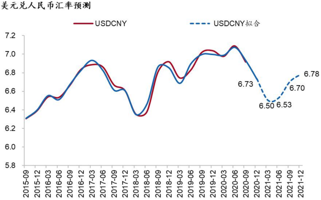 综合来说,人民币汇率整体走势预计仍然偏强,但受制于部分积极因素出现边际变化,人民币汇率的升值将不会是直线型,而是双向波动型,节奏上将呈现先升后贬的形态,上半年为较好的购汇窗口。2021年美元兑人民币汇率的中枢水平预计为6.6,波动区间为6.3-6.9,较2020年平均水平升值超4%。