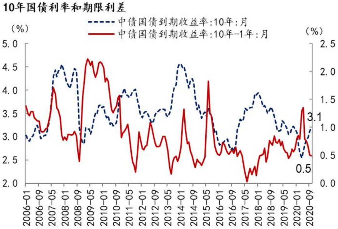 与利率更相关的是社融和M2同比增速之差,若两者在明年双双见顶回落,那下一个问题是谁回落得更快?若M2同比增速下行更快,则利率仍有上行的驱动力。若M2同比增速下行趋缓,甚至上升,则利率可能出现磨顶,甚至回落。M2同比增速的走势更多取决于央行货币政策取向,若商业银行负债端成本上行更多,甚至与资产收益形成倒挂,则会压制资产端增速,M2增速也会随之放缓。以2017年为例,社融同比增速开始回落,但M2同比增速回落更加快速,在央行加息背景下,质押式回购和同业存单利率均大幅抬升。10年-1年国债利差也持续回落,且降至历史低位。若央行收紧幅度偏缓,资金利率抬升幅度偏低,负债和收益之间仍能维持在合理水平,期限利差维持或缓慢压缩,则M2同比增速下行偏缓,此时利率可能出现磨顶,甚至在经济数据稳定或阶段性下滑时,利率会有一定幅度的回落。