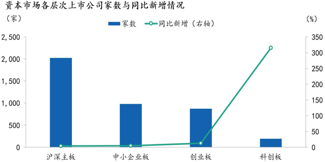 多层次资本市场的完善有望进一步激发市场活力,发挥直接融资功能。从多层次市场结构方面看,截至2020年11月,全A上市公司合计4,083家,较2019年3,777家上升306家。从板块分布来看,沪深主板共2,024家,同比新增4%;中小板共982家,同比新增4%;创业板共871家,同比新增12%;科创板共191家,为去年同期三倍水平。不难发现,自科创板上市、创业板注册制以来,科技型、创新型企业的上市明显提速,未来更多科技创新型企业有望登陆相应板块,市场活力有望进一步激发,直接融资功能有望得到充分发挥。