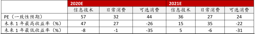 考虑到2020年这类热门行业涨幅显著,估值已到达近十年较高水平,明年的上行和下行空间有多少,已成为市场比较关注的问题之一。我们不妨从过往表现中寻找线索,以信息技术、日常消费和可选消费为例,按照2020年估值全年一致性预期来看,全年估值若到达预期水平,则在历史上对应未来1年内涨跌幅区间分别为[-8%, 47%]、[-1%, 27%]、[-35%, 26%]。