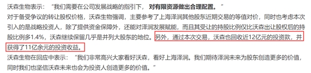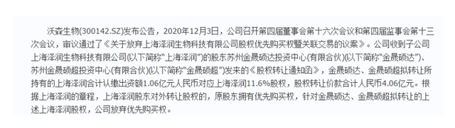 12月4日,沃森生物(300142.SZ)公告以11.4亿元转让上海泽润生物科技有限公司(下称“上海润泽”)32.60%股权,同时放弃增资的优先认可权,交易完成后沃森生物持有上海泽润28.5%的股权(此前为67.8%),上海泽润将不再是沃森生物的控股子公司。