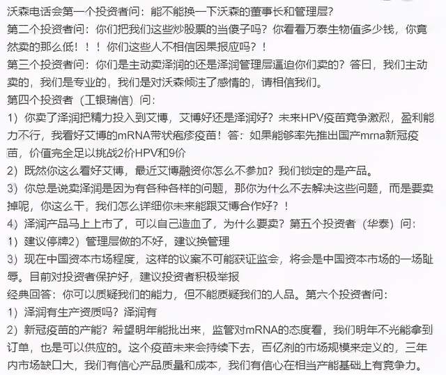 另外,有投资者对沃森生物此番出售上海润泽的行为十分不满意,询问沃森生物人员为何不提前停牌,对沃森生物的管理层的管理能力产生质疑,并且表示疫苗是关乎民生的重要事情。