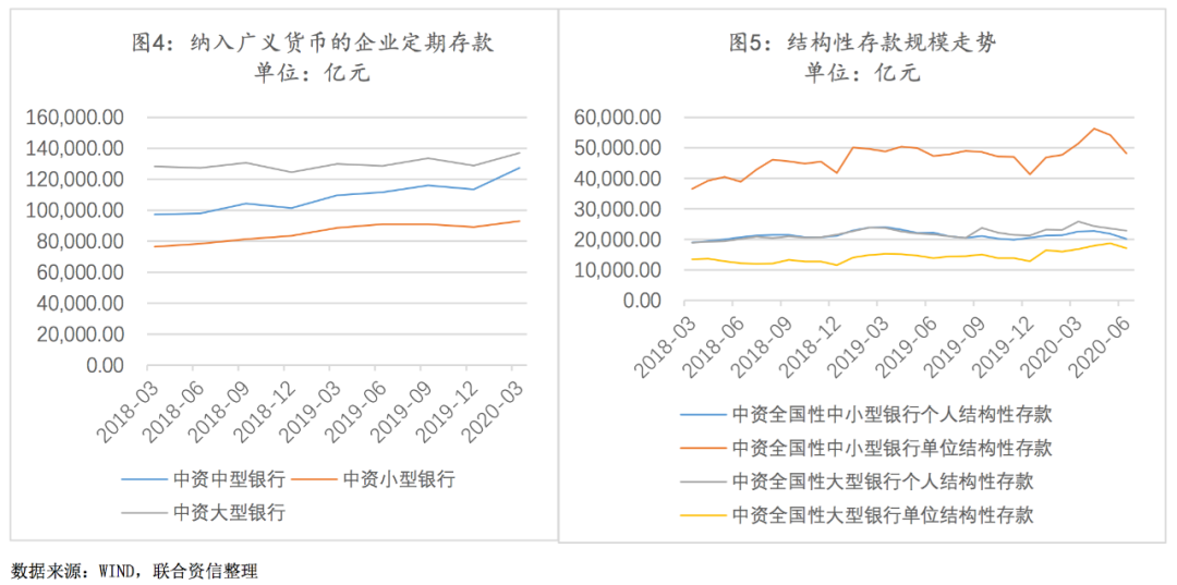 存款定期化与结构性存款规模增长致使存款付息率明显提升,从而推升了银行资金端的成本水平。近年来,为响应国家普惠金融的号召,以国有行及股份行为主的大型银行将金融服务不断下沉,区域性中小银行在当地的竞争环境日趋激烈。为保持存款业务在当地的竞争力,中小银行将定期存款利率上浮至同业较高水平,并依托在当地营业网点广泛、经营历史较长等优势进行展业,带动了定期存款规模整体呈增长趋势(见图4)。此外,为增强存款业务吸引力,以中小银行为主的部分商业银行开展与利率、汇率、指数等波动挂钩的结构性存款业务,该业务需客户承担一定风险,故付息率一般高于同期限的银行存款。2020年前4个月,结构性存款规模增长2.5万亿元,余额突破了12万亿元,刷新了历史新高,其中中小银行增加1.5万亿元(见图5),结构性存款业务的开展一定程度上加大了中小银行存款业务的竞争力,但较高成本结构性存款规模的增长也使得存款付息率明显提升。